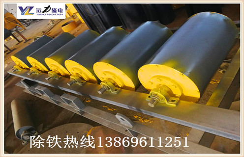 相當(dāng)于把干式弱磁滾筒裝在皮帶運(yùn)輸機(jī)上代替頭輪,或者說(shuō)在皮帶機(jī)頭輪內(nèi)裝上磁系。磁系包角為360度。主要由:磁系、滾筒、磁軛、鋁環(huán)、皮帶組成。