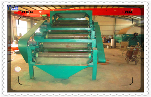 2、四輥錳礦磁選機是我公司新研制成功的磁分離設備。磁系全部采用高性能稀土釹鐵硼材料和優質鐵氧體材料制做,經過巧妙的開放式磁路設計,筒表分選區高磁感應強度達到0.8T以上,磁場強度是常規中磁機的3-5倍,分選區的磁場力可達到電磁強磁選機的磁力水平。